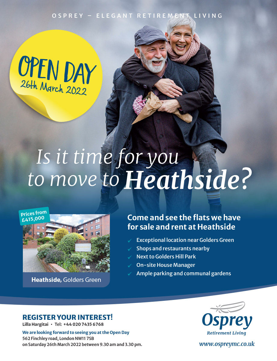 We now have a selection of 1-bedroom and 2-bedroom flats for sale and rent in our retirement home at Heathside near Golders Green in London. We invite you to come to our Open Day on Saturday, 26th March to see the building and the flats and meet our community and our staff. We will be there from 9.30 am until 3.30 pm and we will do our best to answer all your questions about independent living in Heathside.
